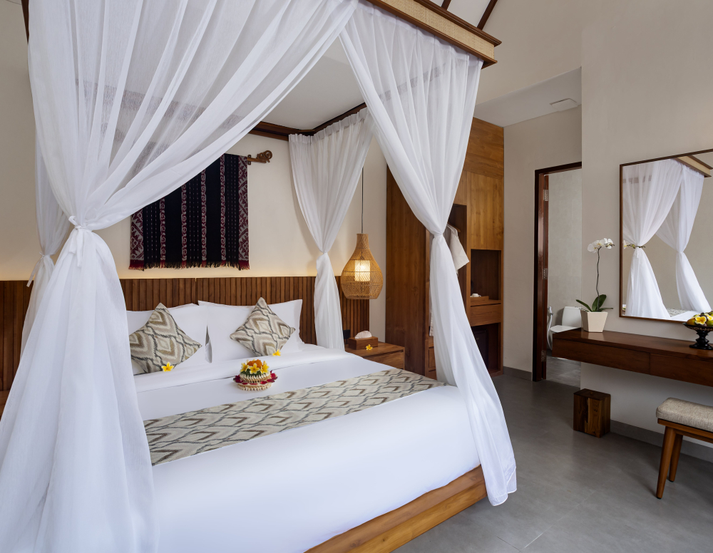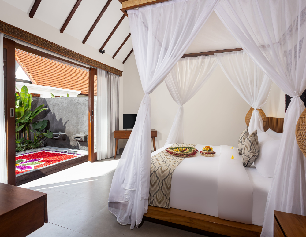 The villa features a modern open-concept design, blending natural elements with elegant touches. Lounge by your private pool, unwind in the airy bedroom, and enjoy a peaceful night’s sleep surrounded by nature and comfort.